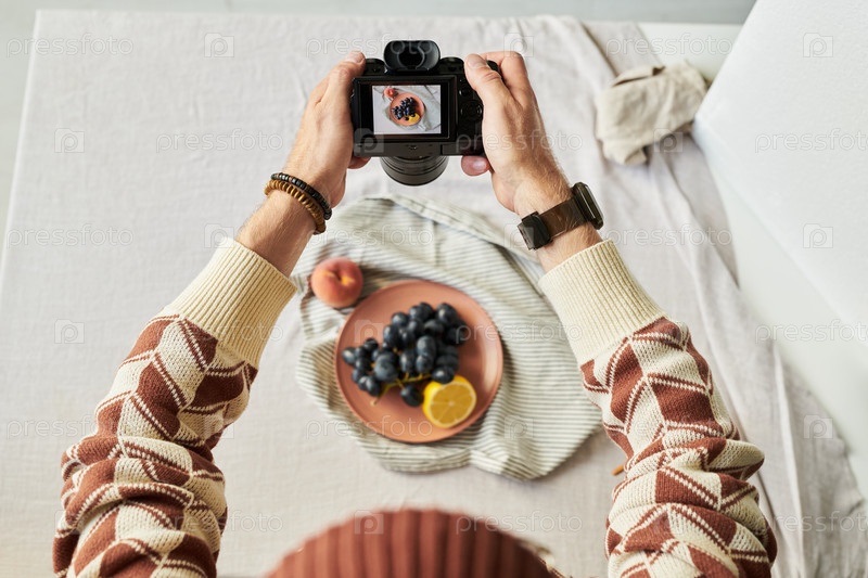 Мужчина фотографирует фруктовую тарелку с помощью цифровой камеры
