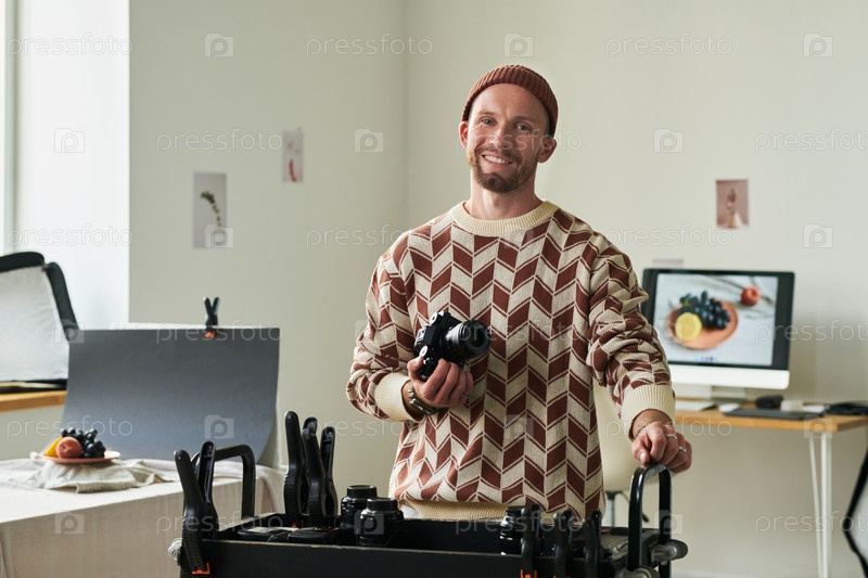 Портрет улыбающегося мужчины, держащего камеру в помещении