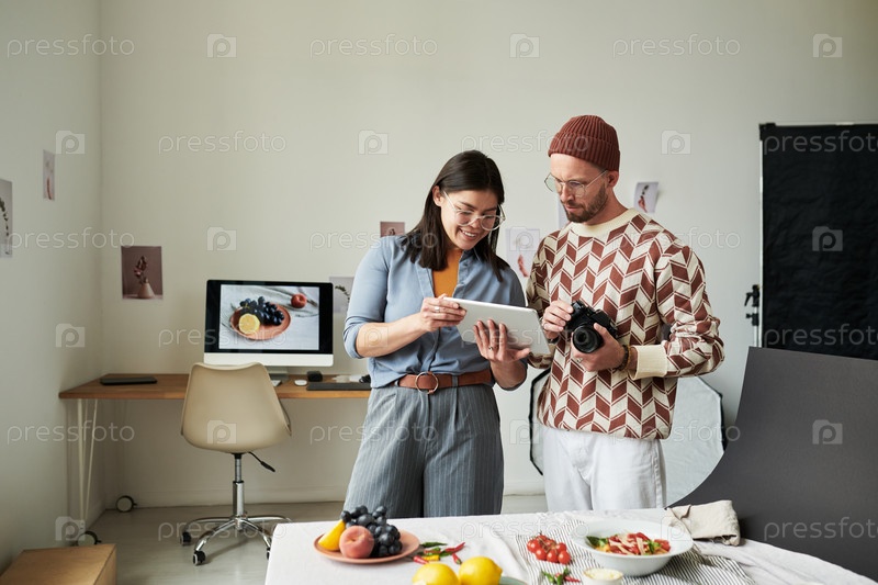 Женщина и мужчина вместе просматривают фотографии на планшете