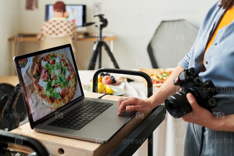 Женщина фотографирует пиццу с ноутбуком в студии