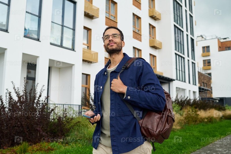 Молодой чернокожий мужчина ходит на улице, держа смартфон и рюкзак