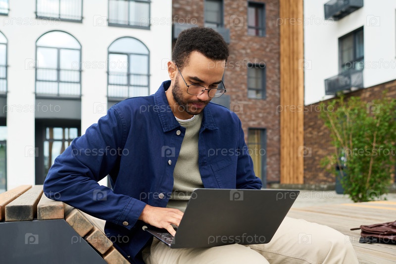 Молодой чернокожий мужчина работает над ноутбуком на открытом воздухе в городском жилом районе