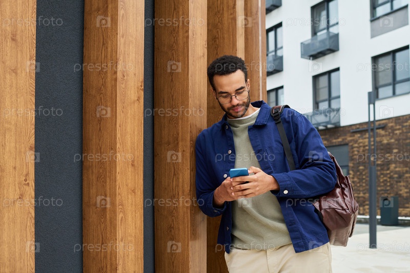 Молодой чернокожий мужчина стоит на открытом воздухе, используя смартфон возле современного здания