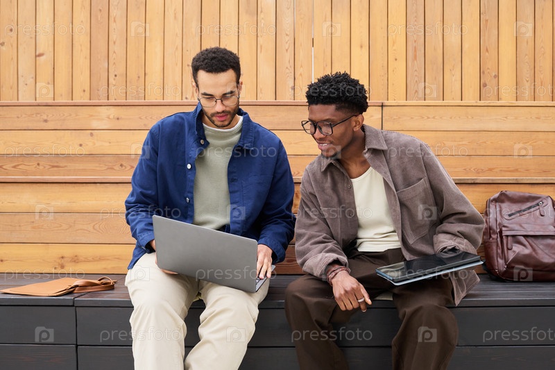 Молодые мужчины, сотрудничающие на ноутбуке и планшете в современной внешней обстановке