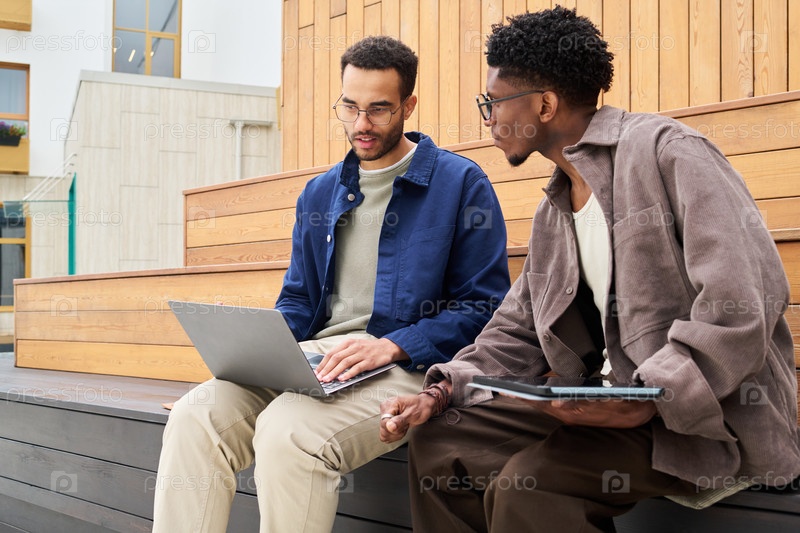 Молодые мультиэтнические мужчины сотрудничают на открытом воздухе, используя ноутбук и планшет