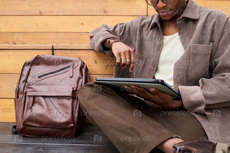 Молодой чернокожий мужчина сидит на улице, используя цифровой планшет для учебы