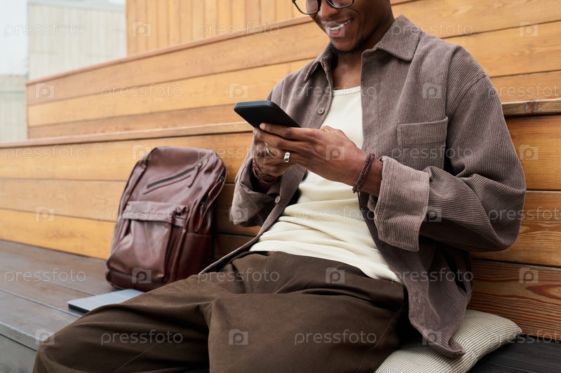 Чернокожий молодой человек, сидящий на улице с помощью смартфона и улыбающийся