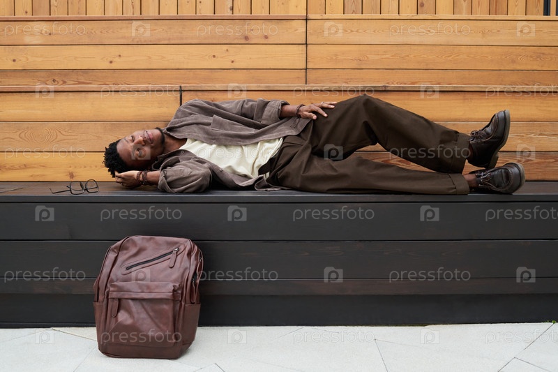 Молодой чернокожий человек отдыхает на улице на скамейке с рюкзаком поблизости