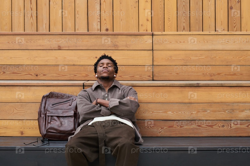 Молодой чернокожий мужчина отдыхает на открытом воздухе с рюкзаком, сидящим у деревянной стены
