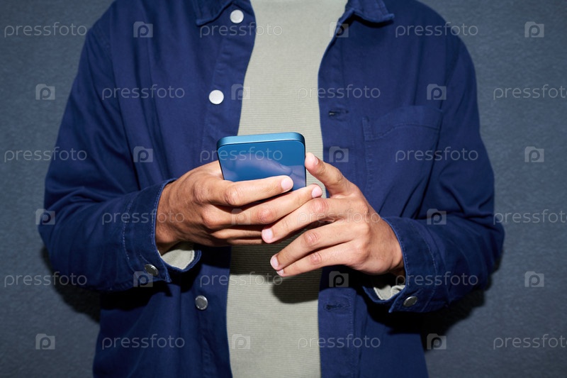 Молодой человек использует смартфон, стоя на стене