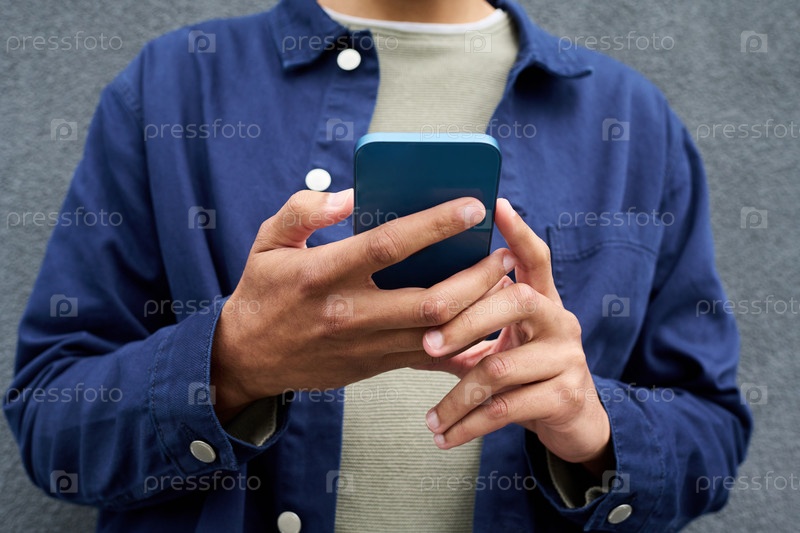 Молодой человек использует смартфон, стоя против серой стены на открытом воздухе