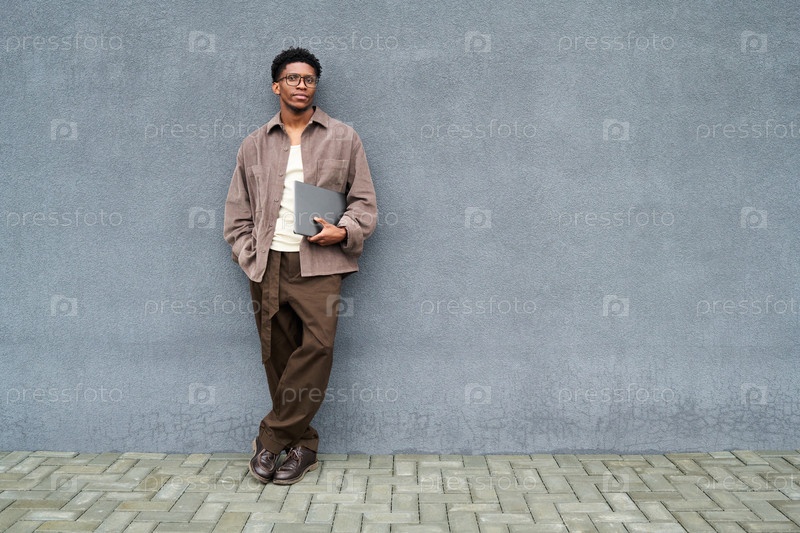 Молодой чернокожий мужчина стоит на улице, держит ноутбук против серой стены