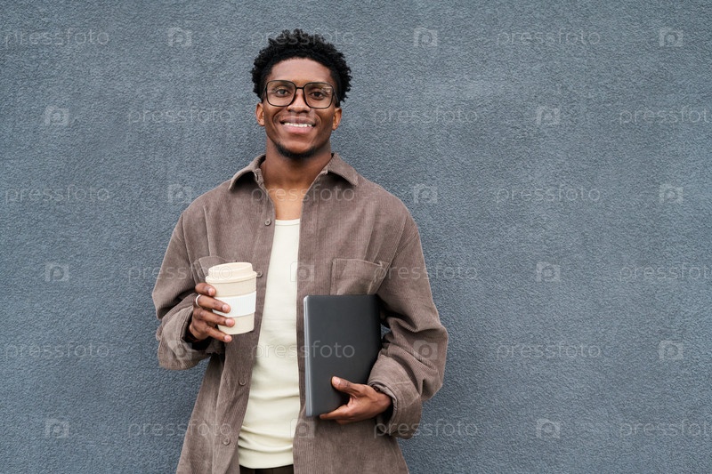 Портрет молодого чернокожего мужчины, улыбающегося в то время как он держит кофе и блокнот