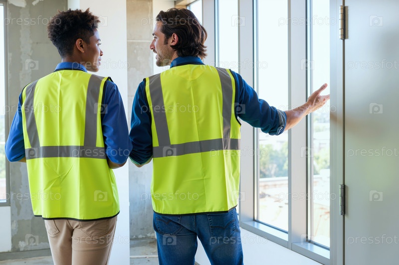 Молодые взрослые многоэтнические рабочие обсуждают строительный проект возле окна