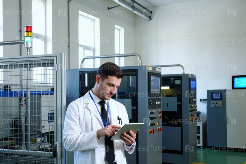 Молодой взрослый мужчина использует цифровой планшет в современной промышленной лаборатории