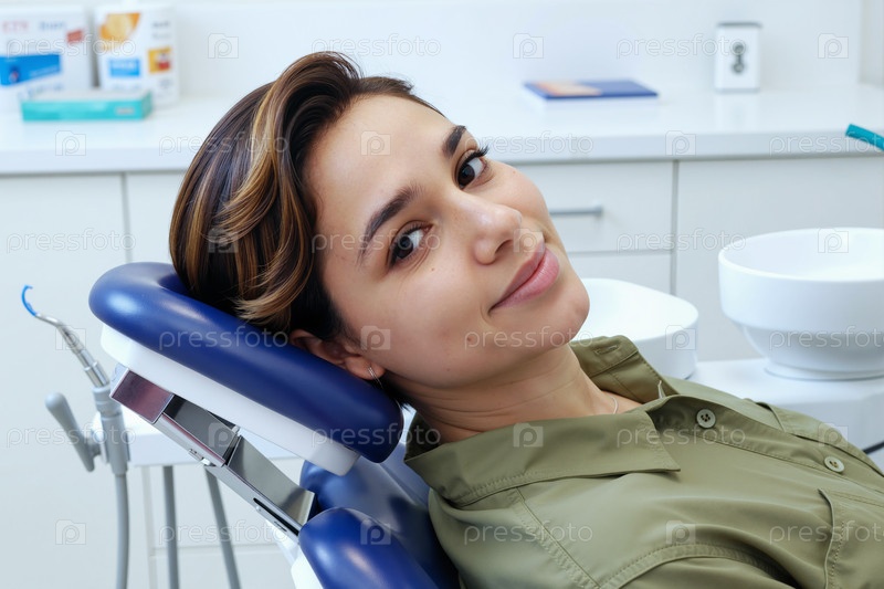 Портрет молодой взрослой женщины, улыбающейся, сидящей в стоматологическом кресле
