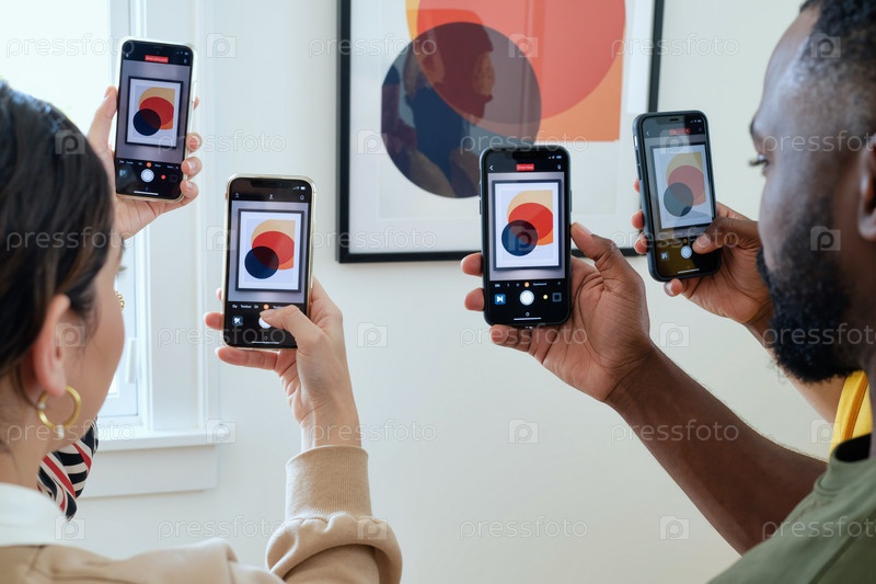 Различные молодые взрослые фотографируют абстрактные произведения искусства с помощью смартфонов в помещении