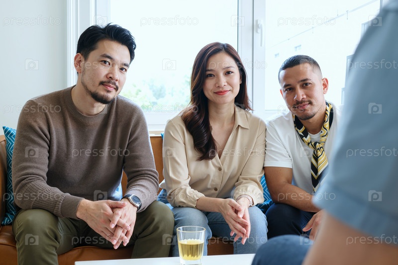 Молодой азиатский мужчина и женщина с молодым латиноамериканцем внимательно слушают в помещении