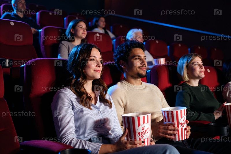 Молодая женщина и бирациальный мужчина смотрят фильм в кинотеатре с попкорном
