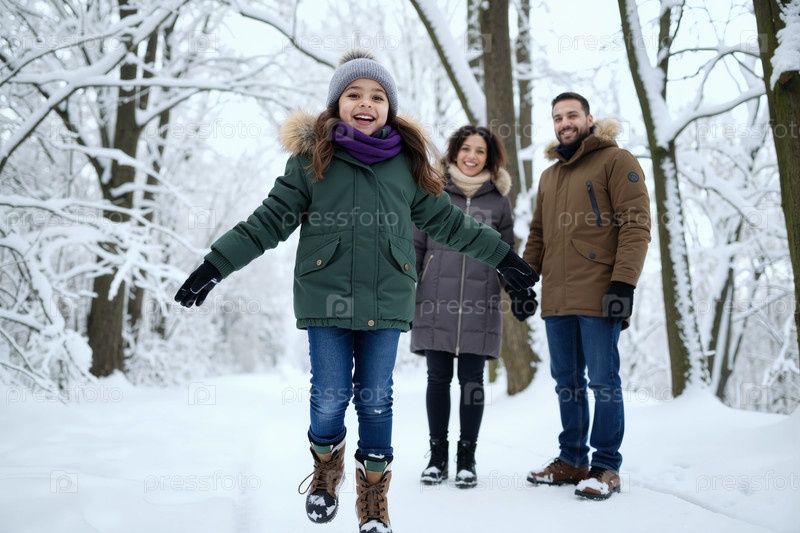 Семья гуляет вместе в снежном зимнем лесу, наслаждаясь природой