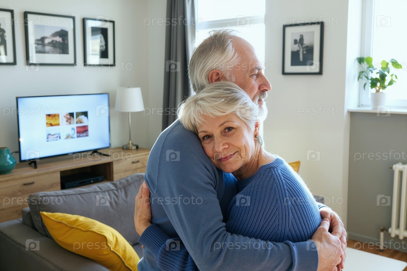 Портрет старшей женщины, обнимающей старшего мужчину в помещении