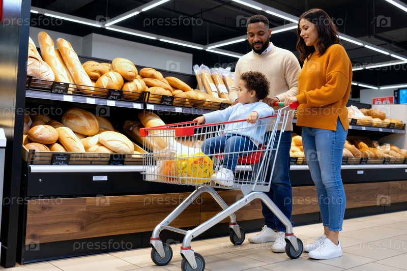 Молодая женщина и чернокожий мужчина делают покупки с ребенком в супермаркете