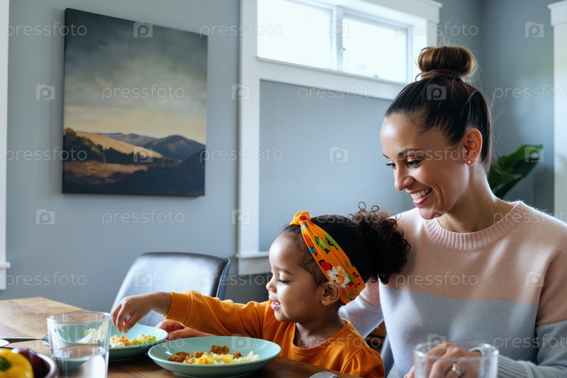Женщина и молодая бирациальная девочка-ребенок вместе завтракают