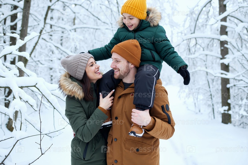 Молодая семья наслаждается зимней прогулкой в снежном лесу вместе