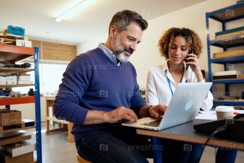 Мужчина средних лет сотрудничает с молодой взрослой чернокожей женщиной, использующей ноутбук