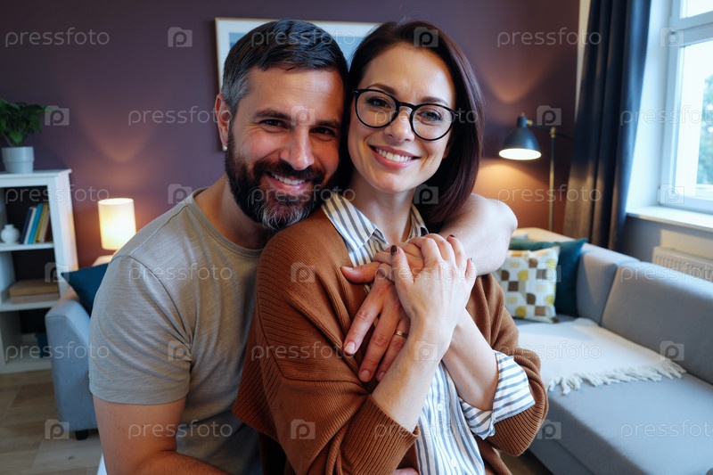 Портрет взрослой пары, улыбающейся и обнимающейся в помещении