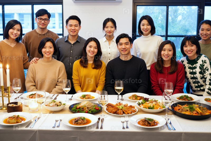 Группа улыбающихся молодых взрослых азиатских мужчин и женщин, собравшихся за обеденным столом
