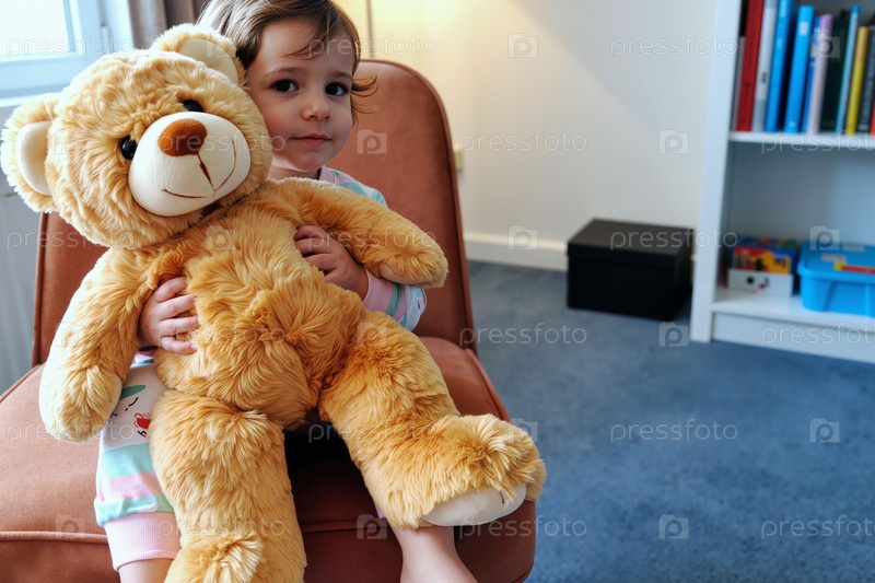 Портрет ребенка, обнимающего плюшевого тедди-медведя во время сидения в помещении