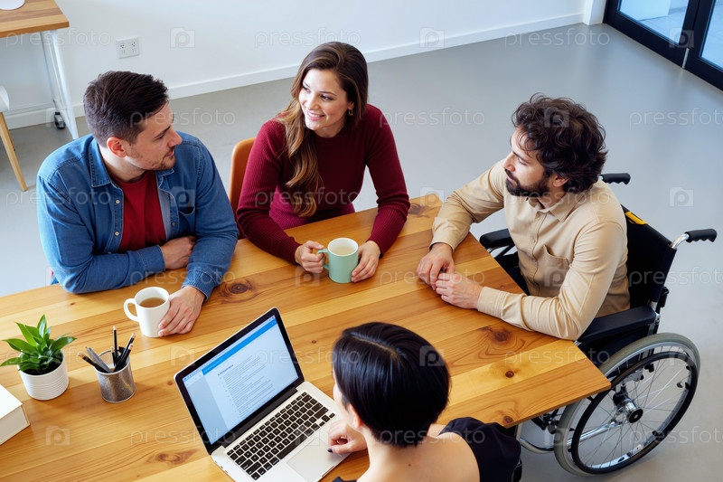 Молодые взрослые, сотрудничающие в офисе, встречаются с мужчиной-инвалидом