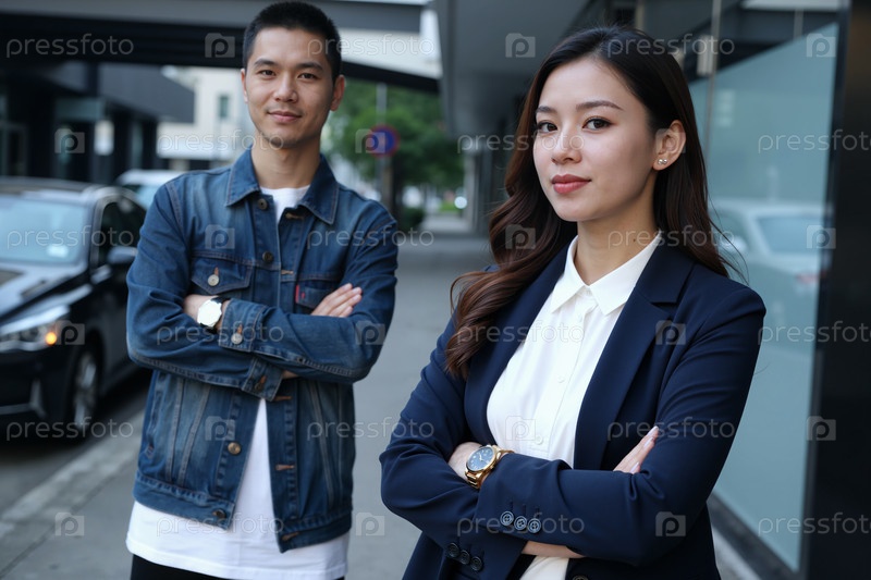Молодой азиатский мужчина и женщина, уверенно стоящие на улице с перекрещенными руками