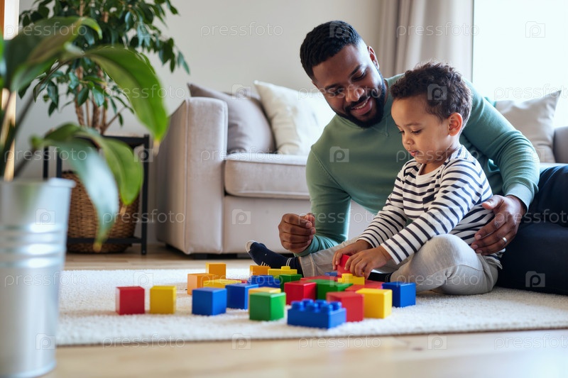 Молодой взрослый мужчина помогает ребенку Черный мальчик строит красочные блоки в помещении