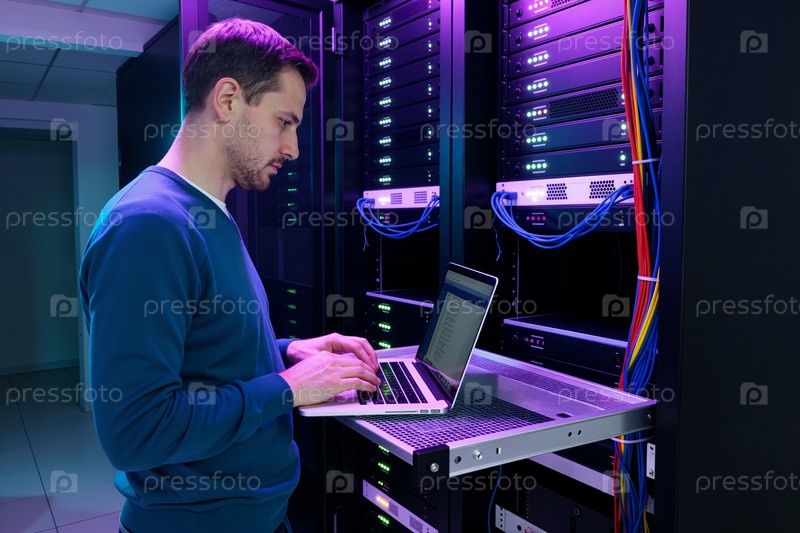 Молодой взрослый человек управляет обслуживанием серверов в комнате центра обработки данных