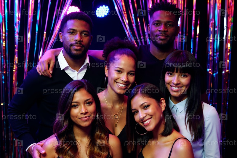 Мультиэтнические молодые взрослые улыбаются и позируют вместе на праздновании вечеринки