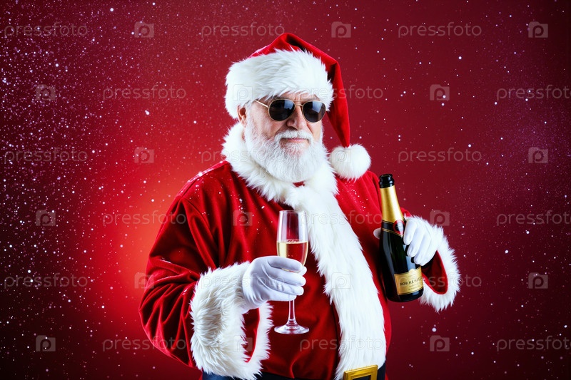 Портрет пожилого человека в костюме Санты, держащего бокал шампанского