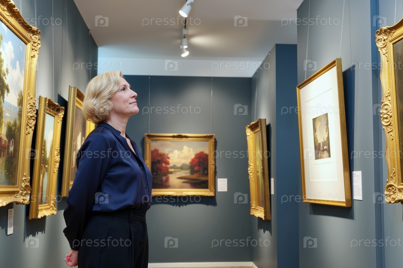 Женщина средних лет восхищается картинами на выставке в художественной галерее