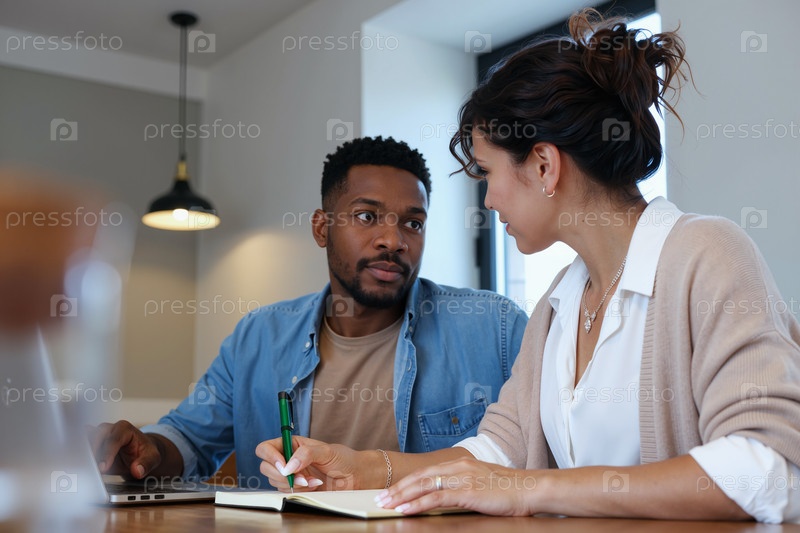Молодая женщина объясняет проект молодому чернокожему мужчине в офисной обстановке