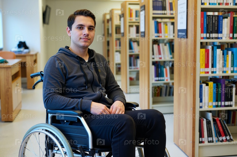 Портрет молодого взрослого мужчины, сидящего в инвалидной коляске в библиотеке