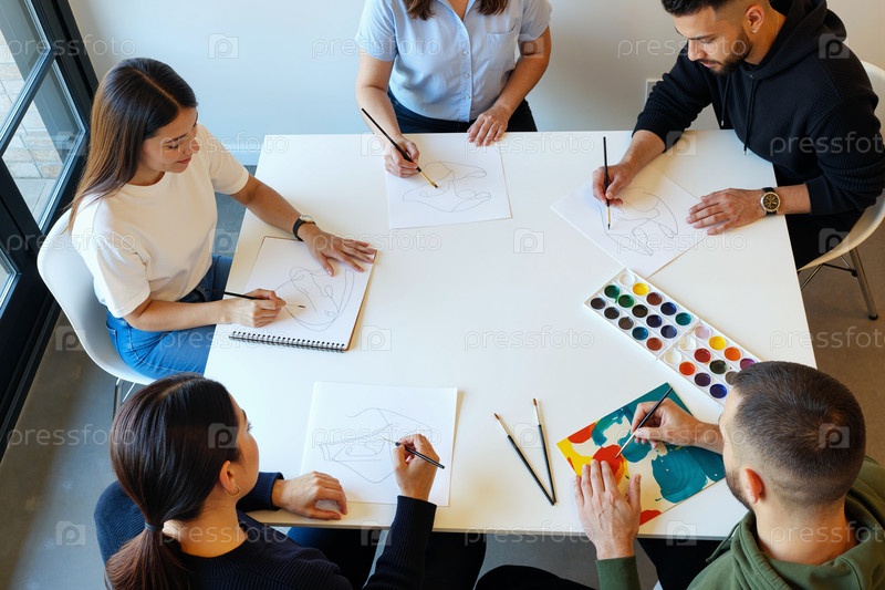 Разнообразные молодые взрослые рисуют абстрактное искусство вместе во время творческого семинара