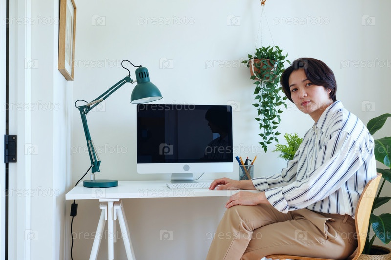 Портрет молодого взрослого азиатского мужчины, сидящего за рабочим столом с помощью настольного компьютера