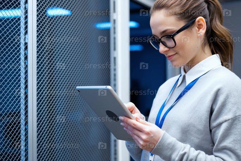 Молодая взрослая женщина использует цифровой планшет в среде центра обработки данных