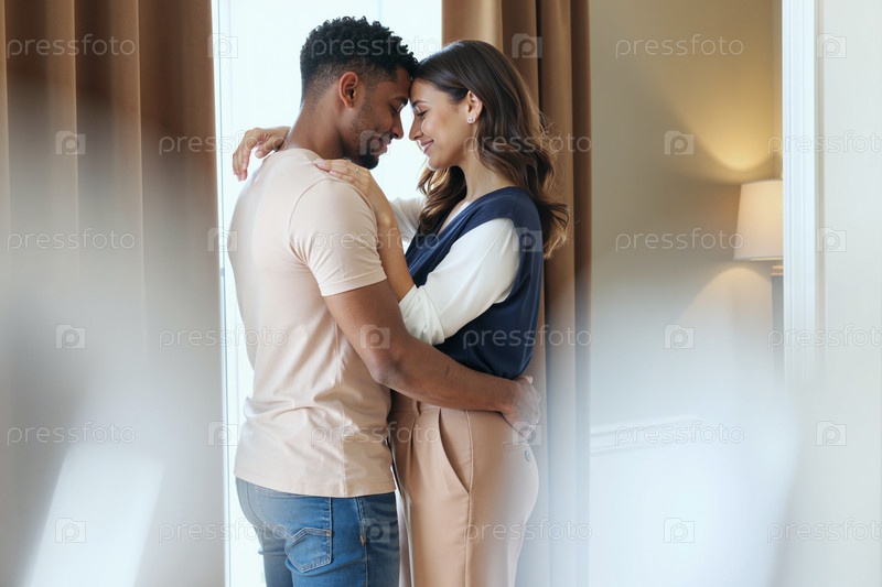 Молодая взрослая мультиэтническая пара, которая ласково обнимается в помещении