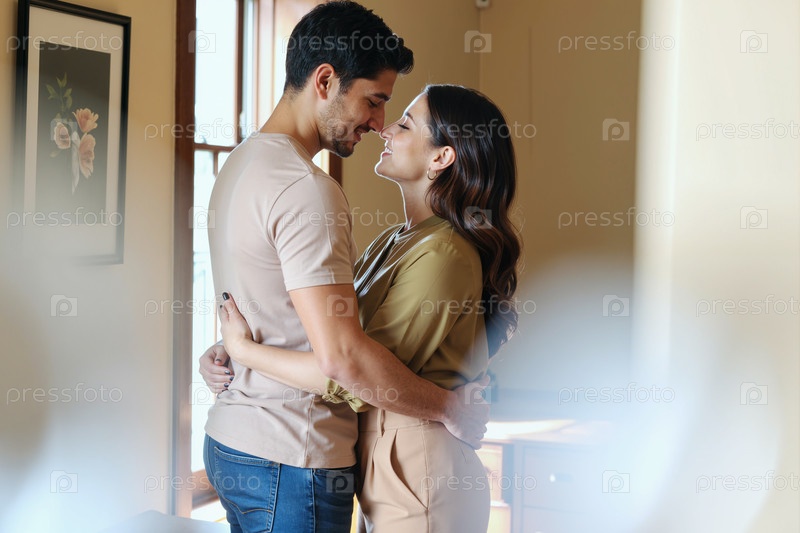 Молодая взрослая пара, которая ласково обнимается в помещении и улыбается