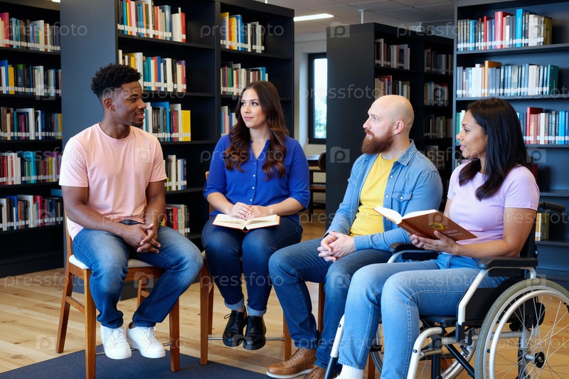 Разнообразные молодые взрослые, участвующие в групповой дискуссии в библиотечной обстановке