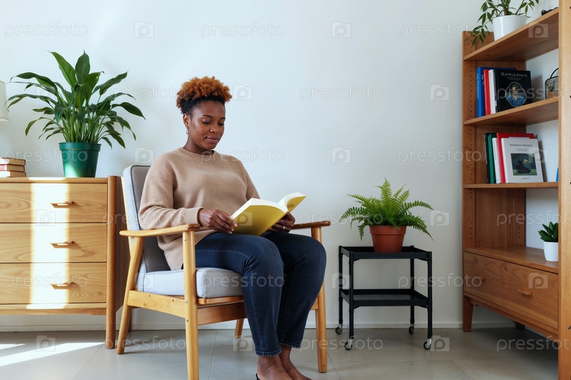 Молодая взрослая чернокожая женщина сидит на стуле, читает книгу в помещении