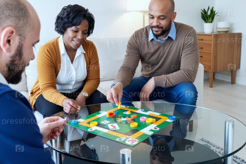 Мультиэтнические молодые взрослые играют в настольную игру вместе в современной гостиной