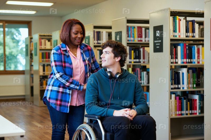 Чернокожая женщина среднего возраста помогает молодому взрослому мужчине с инвалидностью